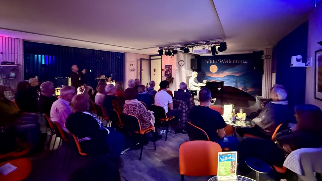 Stand da etwa Frank Zappa bei der Tür, während der Gastgeber Jean-Pierre Kousz und die Gastgeberin Barbara Münch wie stets in herzlichen Worten das Publikum und den Künstler vor erneut ausverkauftem Haus begrüsste? Nein: es war der deutsche Blues- und Boogie-Pianist Thomas Scheytt, Jahrgang 1960, der nun ebenfalls die Zuhörer begrüsste und eine Improvisation „mit dem etwas umständlichen Namen“ ankündigte: „Hallo und guten Abend liebe FreundInnen der Villa Wellentanz“.