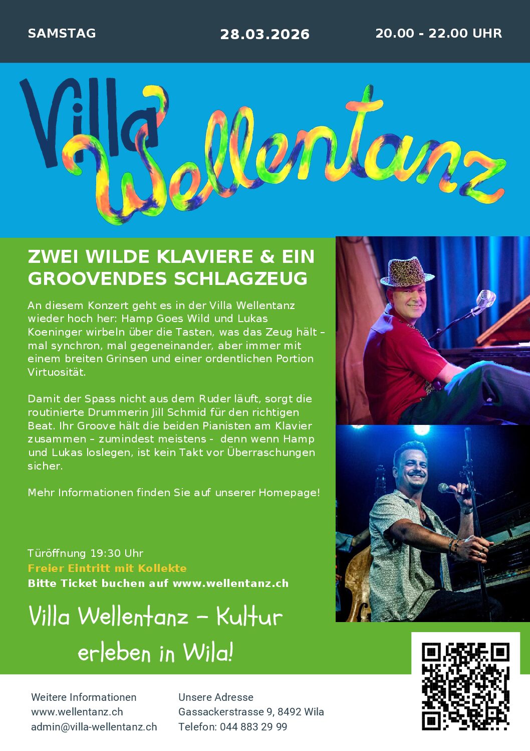 Freuen Sie sich auf einen Abend voller boogie-woogender Energie, jazziger Improvisationen und musikalischer Schlagabtausche, die das Publikum von der ersten bis zur letzten Minute mitreissen. Villa Wellentanz at its best – nah, lebendig und unverwechselbar.